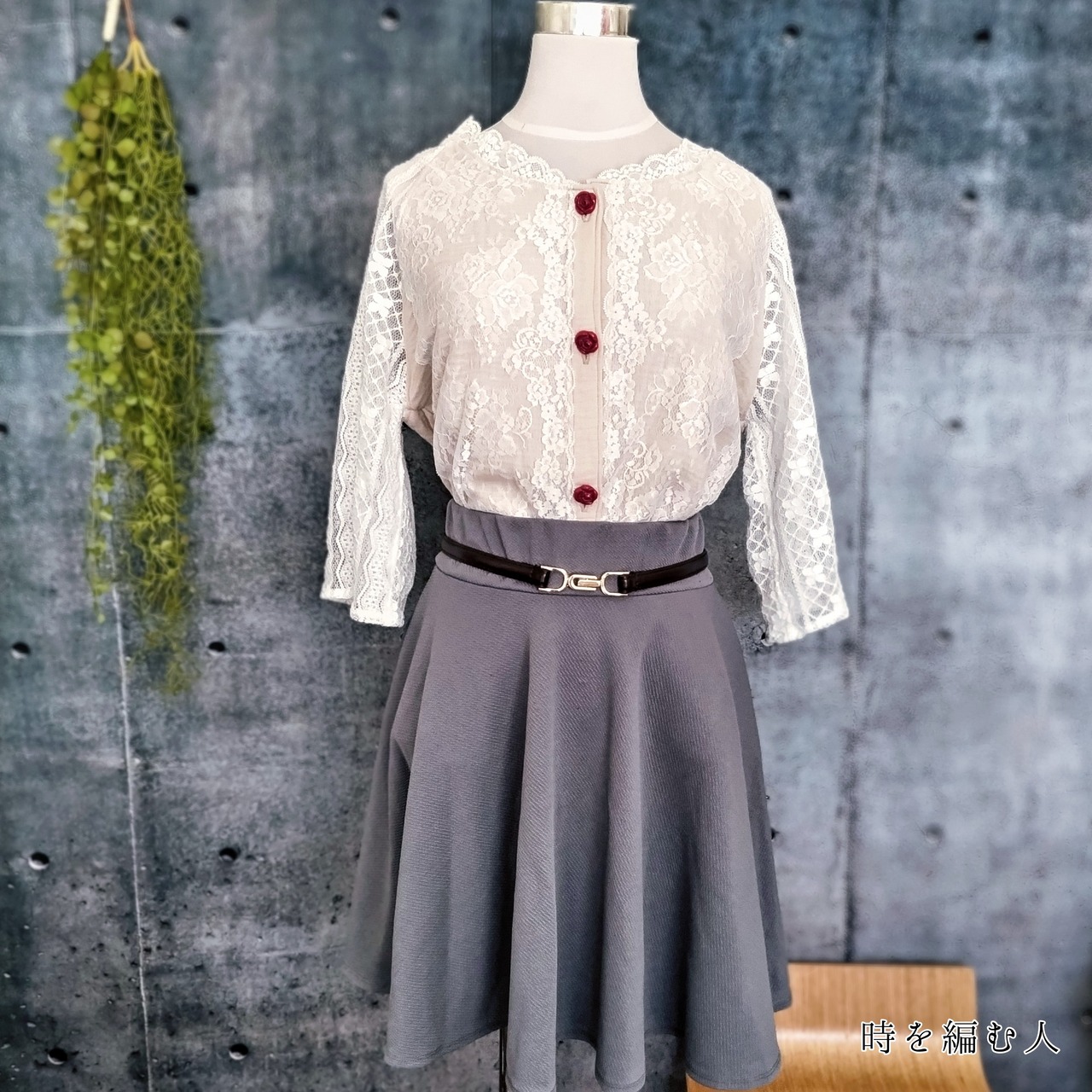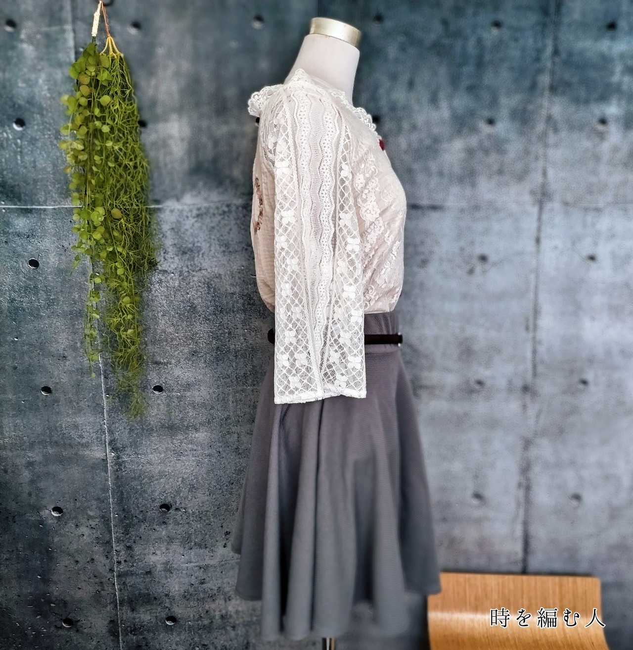 さらに袖口から首元へと広がるレーススリーブが、動くたびに軽やかに揺れ、今の季節の空気にとけこむような印象を添えてくれます。