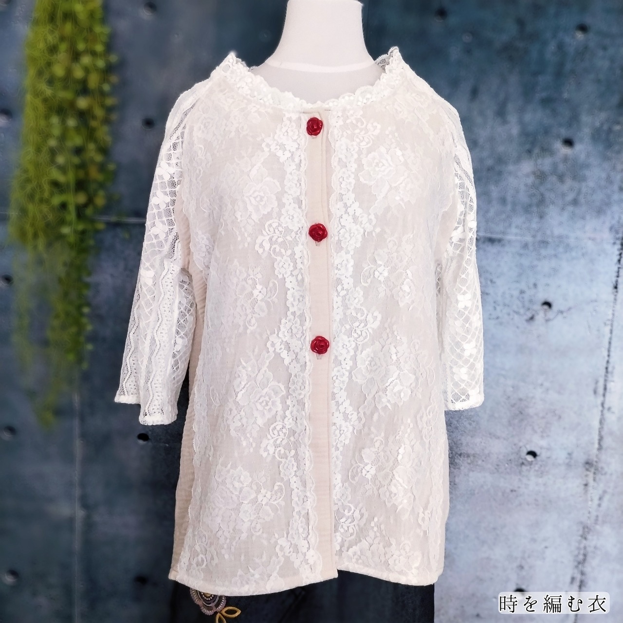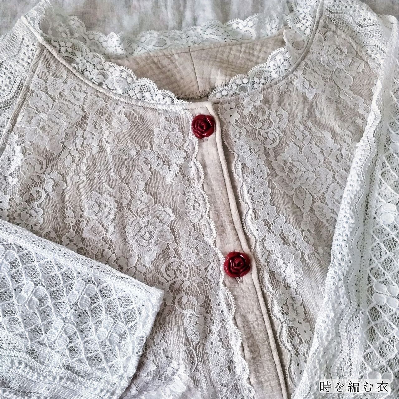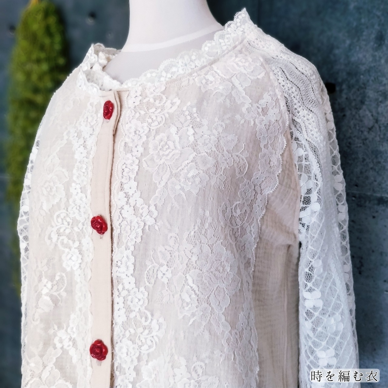 繊細なレースを前面に重ね、赤い薔薇のプラボタンがワンポイントに。