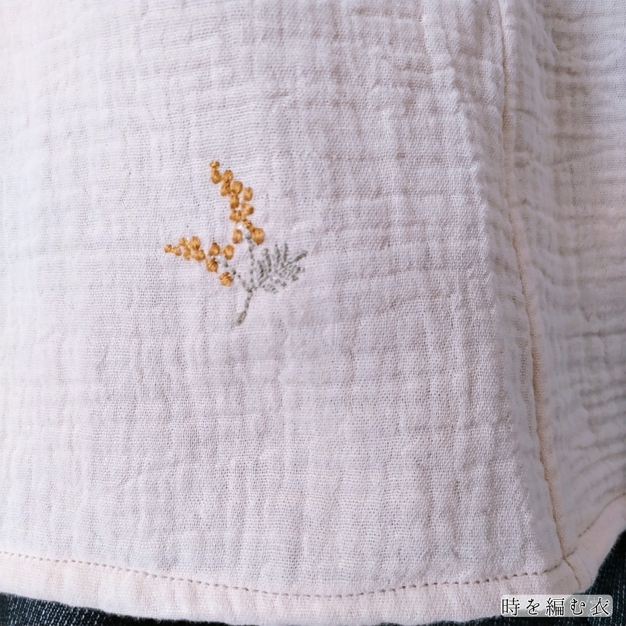 胸元にそっと咲いたのは、ミモザの刺繍。