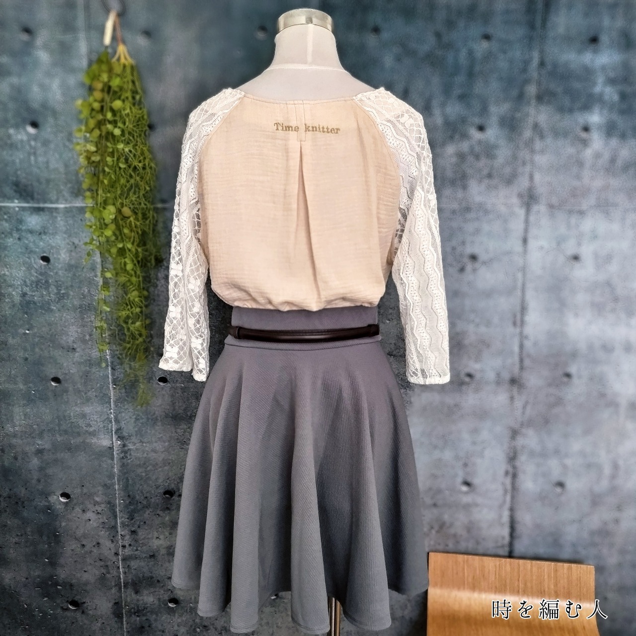 さらに袖口から首元へと広がるレーススリーブが、動くたびに軽やかに揺れ、今の季節の空気にとけこむような印象を添えてくれます。