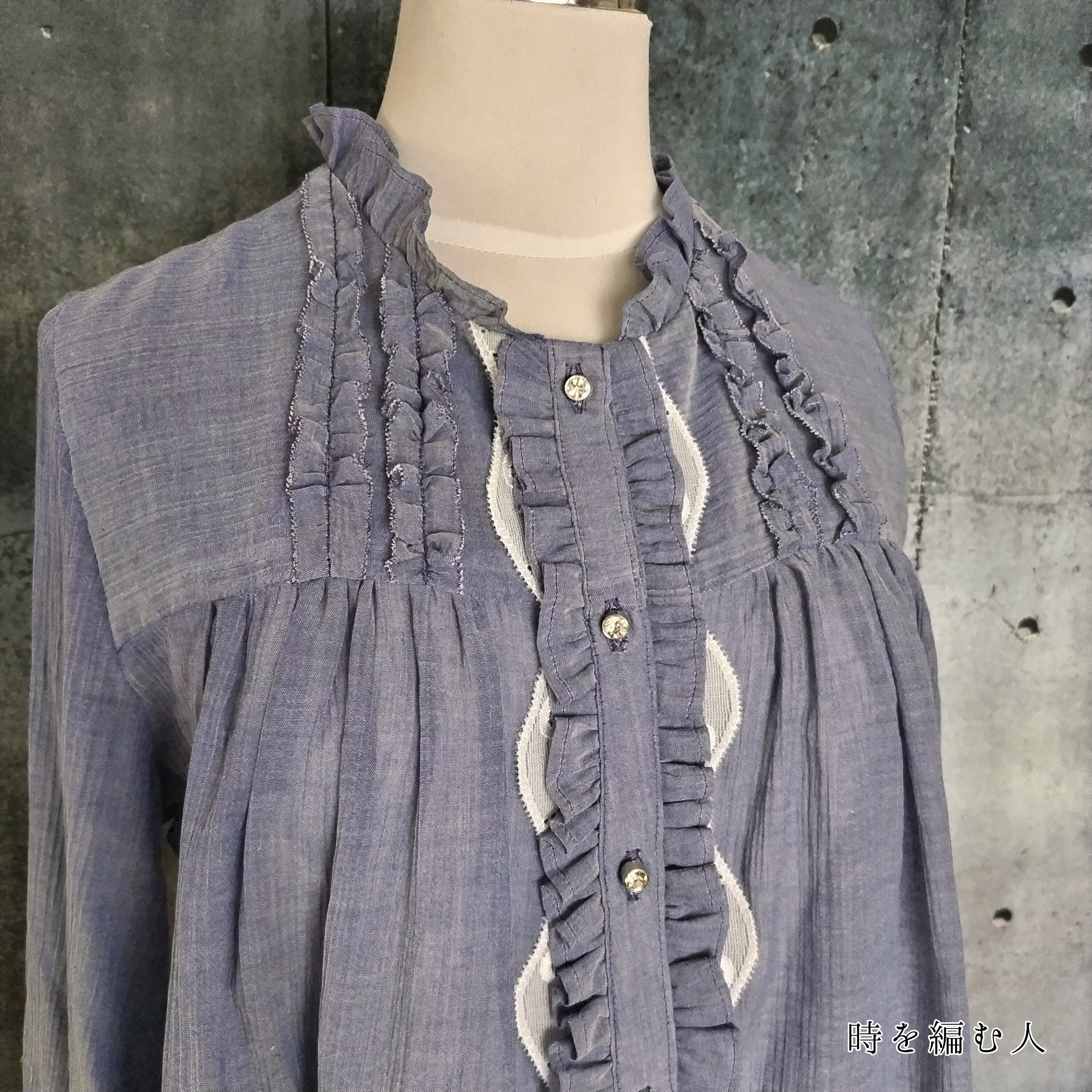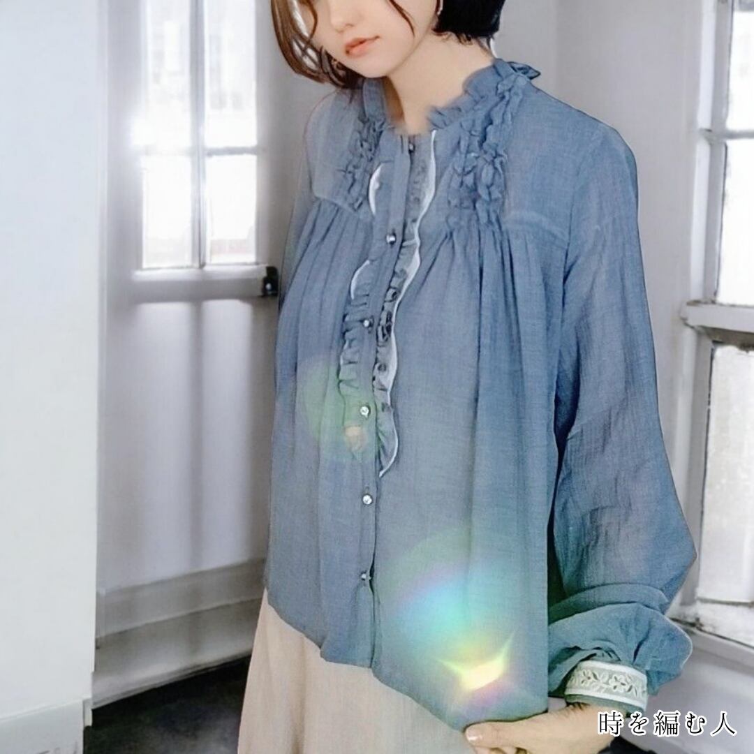 小説の中に描かれた、彼女の切なくも穏やかな時間を思わせるこのブルーのフリルブラウスは、あなた自身の物語を織り込むキャンバスとなってくれます。胸上のフリルとたっぷり寄せたギャザーは、物語の彼女のそっと揺れる心のように柔らかく、着る人の動きに寄り添います。